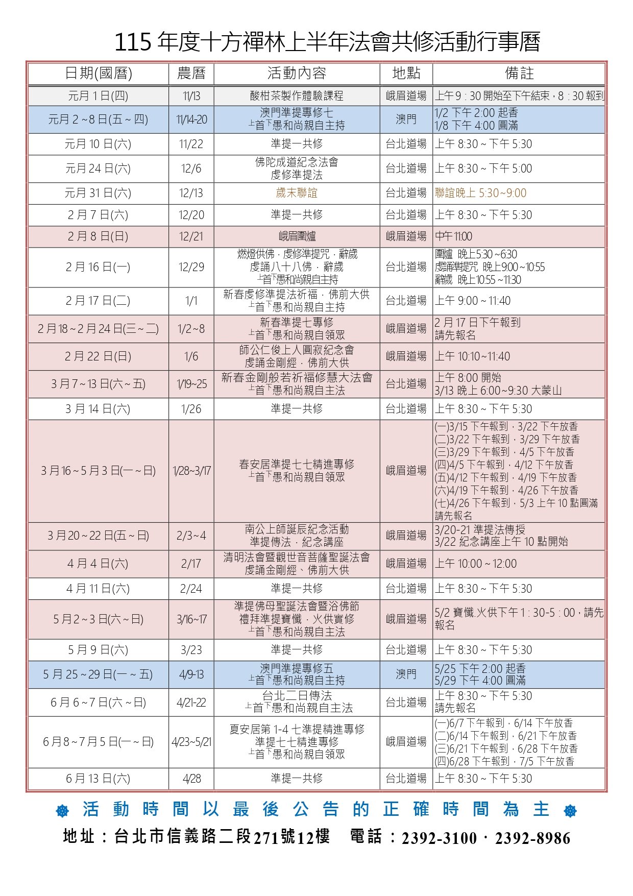 | 元月18日(六) | 12/19 | 歲末聯誼 | 台北道場 | 聯誼晚上5:30~9:00 |